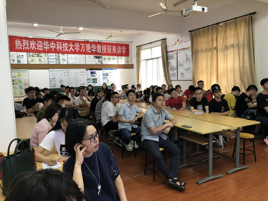 报告开始,万教授首先引出我国目前养老问题日益凸显和美丽乡村建设大力推行两个方面作为研究背景,接着解释了美丽乡村、乡村休闲养老、休闲养老型美丽乡村等概念;然后万教授进行了休闲养老型美丽乡村建设的适宜性与时效性方面的分析,得出该规划策略可以缓解社会养老压力、加速美丽乡村建设、实现城乡良性互动等结论;然后万教授对乡村休闲养老模式建设要求和美丽乡村建设要求进行阐述,并对两者耦合后的新型模式进行深度解析;万教授的讲解,理论与实例相结合,生动形象、寓意深刻。在报告最后,万教授以黄冈市黄州区松杨村美丽乡村建设为例,通过介绍建设规划概况,详细进行了特定规划策略分析,并以此实例作报告总结,深入阐述了休闲养老型美丽乡村建设策略的可行性与优越性。万艳华教授的报告逻辑缜密、实例丰富,讲解深入浅出,旁征博引,与会师生均受益匪浅。在报告结束后,万教授同与会教师就该规划策略进行沟通交流,并耐心详细解答了在场员工提出的相关问题,并且称赞员工具有自己的思考和严谨认真的学习态度。整场学术交流活动氛围轻松愉快,交流互动积极热烈。