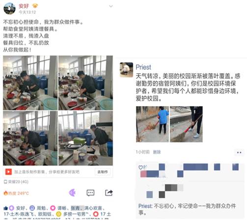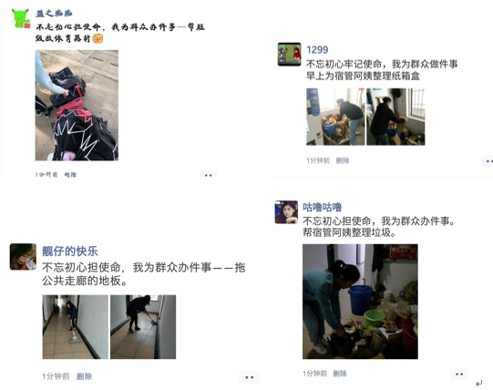 帮武昌校区退休老教师送午餐、打扫宿舍集体区域卫生、帮宿管阿姨整理宿舍垃圾、清扫教学楼教室卫生、清理宿舍区域小广告、整理学校摆放无序影响校园环境的自行车、帮助食堂阿姨回收餐盘……等等一件件小事,聚少成多,聚沙成塔,形成集群效应,向武昌校区展示了土建学院员工党员和积极分子的担当。