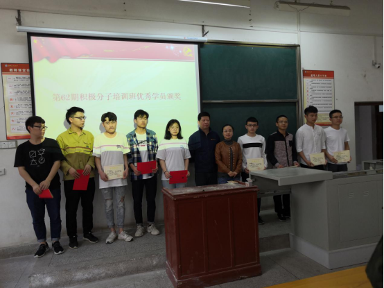 典礼上,分党委副书记郭飞宣读了第62期积极分子培训班优秀学员名单,并与郭昕一同为优秀学员颁发证书且合影留念。随后,第62期极分子培训班优秀学员代表周江林发言,分享了在积极分子培训期间的学习体会和收获;第63期极分子培训班新学员代表梁倬彰发言,代表本期新学员向组织保证,珍惜此次学习机会,做一个追梦人,在青春的岁月努力奔跑;第5期发展对象培训班新学员代表梁建军发言,倡导大家要坚定入党的信念,以合格的党员标准来规范自己的言行,争取早日入党。