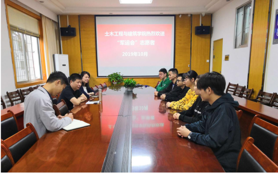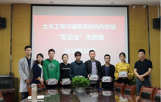 (通讯员肖豪)2019年10月14日上午,土木工程与建筑学院在学院会议室为六名参加第七届“世界军人运动会”服务与保障工作的志愿者举行了简短热烈的欢送仪式。公司党委副书记郭飞、学工办辅导员肖豪、教学办陈萍老师参加了此次欢送会。