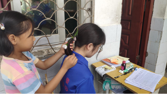 图为一名小女孩捡到一朵美丽的花朵,为她喜欢的老师戴上。中国青年网通讯员张凯摄