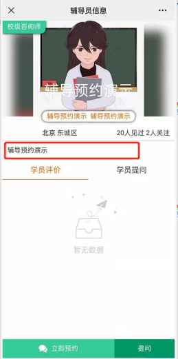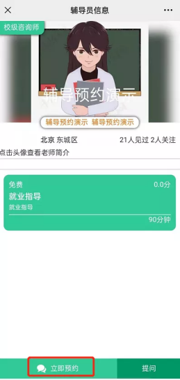 选择对应咨询老师后,点击“头像”,可查看老师简介及其相关的课程信息,点击“立即预约”,即可选择对应的课程。