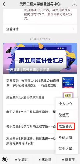 进入公众号后,点击界面右下角“毕业生”-“职业咨询”,进入职业咨询界面,此时可左右或上下滑动,查看咨询老师的相关信息即可预约时间,至少提前三天预约。