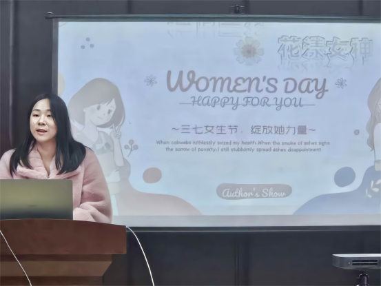 公司心理辅导老师夏添首先表达了对女生们的节日祝福,勉励女生要心中有光,做理想信念的追梦者,以智慧破解成长的烦恼;要手中有书,做自我提升的攀登者,以知识涵养独特气质;要脚下有路,做知行合一的践行者,以行动彰显责任担当。