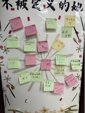 不被定义的她——活动现场布置了以女性力量为主题的展板和条幅,展板上贴满反映偏见的纸条,女生们亲手撕下,写上自己的声音,展现女性的力量。