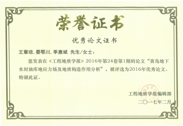 2017年2月23日,《工程地质学报》编辑部公布了该期刊2016年度优秀论文评选结果,公司资土学院青年教师王章琼以第一作者身份发表的论文《黄岛地下水封油库地应力场及地质构造作用分析》成功入选。