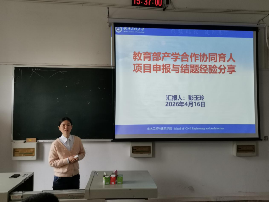 (通讯员 杜智)为进一步推动教学改革与产学融合,提升教师项目申报与结题能力,2026年4月16日下午,土木工程与建筑公司在武昌校区第二教学楼W2404教室举办了2026年第3期教学专题研讨会。本次研讨会主题为“教育部产学合作协同育人项目申报与结题经验分享”,由建筑与城乡规划系主任彭玉玲副教授担任主讲,教学副经理白桃教授主持教研会议,公司全体教师参加交流学习。
